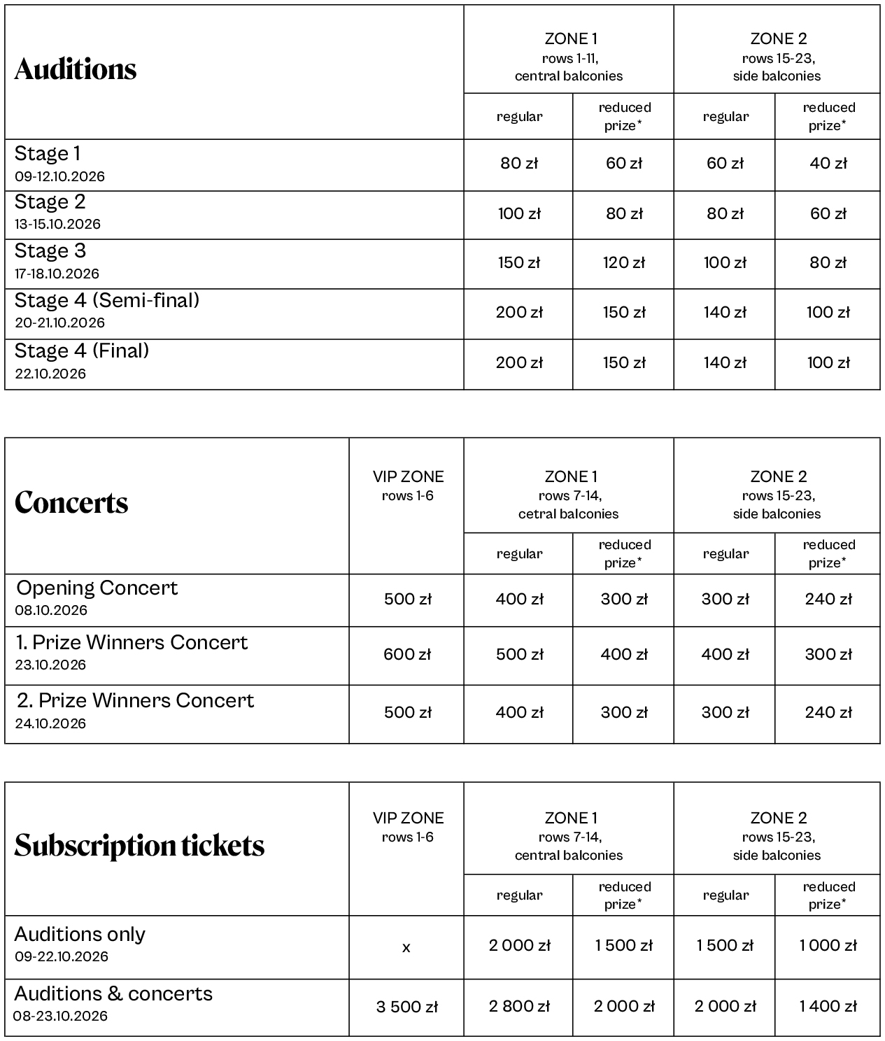 When purchasing 10 or more tickets online for the competition auditions (9-22 October), a 10% discount applies automatically in the cart. This offer does not include the Opening Concert or the Gala.
